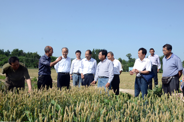 6月2日,由西北農(nóng)林科技大學(xué)教授張保軍任組長(zhǎng),西北農(nóng)林科技大學(xué)教授張正茂、商洛市農(nóng)業(yè)局高級(jí)農(nóng)藝師葉贇、商洛市農(nóng)科所高級(jí)農(nóng)藝師楊寶來(lái)、商洛市種子管理站高級(jí)農(nóng)藝師楊灶靈為成員的項(xiàng)目驗(yàn)收委員會(huì),冒著酷暑驅(qū)車來(lái)到“商麥5226”示范點(diǎn)洛南縣寺坡鎮(zhèn),現(xiàn)場(chǎng)觀摩了小麥的長(zhǎng)勢(shì)和推廣種植情況,聽取了種植戶的評(píng)價(jià)。