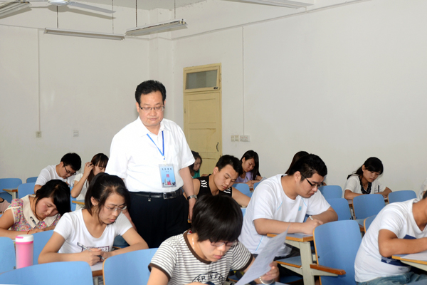 在大學(xué)英語(yǔ)考試現(xiàn)場(chǎng),校領(lǐng)導(dǎo)逐個(gè)考場(chǎng)察看學(xué)生應(yīng)考情況,并詳細(xì)了解了考場(chǎng)秩序、考風(fēng)考紀(jì)、考務(wù)工作等方面的情況。
