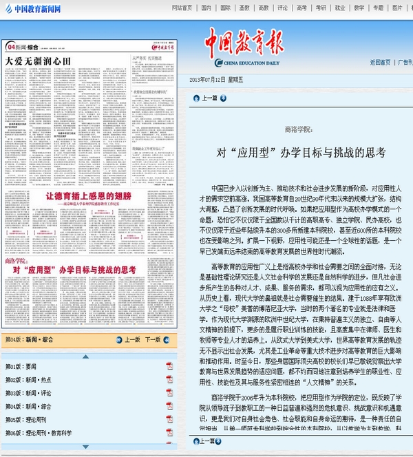 自2006年升本以來,我校著力圍繞發(fā)展、把握大局,適應(yīng)社會(huì)發(fā)展趨勢(shì)和對(duì)人才的需求,立足高等教育發(fā)展實(shí)際和自身定位,制定了建成特色鮮明、多學(xué)科協(xié)調(diào)發(fā)展的應(yīng)用型本科院校的辦學(xué)定位。7月12日,《中國(guó)教育報(bào)》刊登校黨委副書記左曉民署名文章《商洛學(xué)院:對(duì)“應(yīng)用型”辦學(xué)目標(biāo)與挑戰(zhàn)的思考》,介紹了我校應(yīng)用型的辦學(xué)定位與目標(biāo),從辦學(xué)理念、辦學(xué)體系、制度創(chuàng)新等方面闡述了對(duì)建設(shè)應(yīng)用型本科高校的思考。