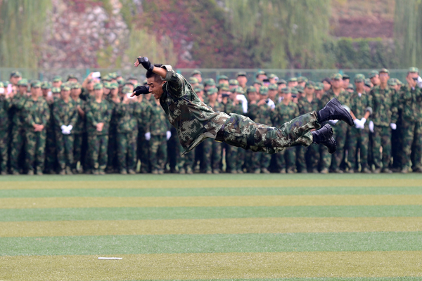 校黨委副書記、院長(zhǎng)劉建林檢閱了軍訓(xùn)方陣,同學(xué)們以飽滿的精神狀態(tài)、嚴(yán)整的軍容和整齊的步伐精神抖擻地通過主席臺(tái)接受檢閱。英武的軍姿、響亮的口號(hào)、整齊劃一的動(dòng)作,充分展示了同學(xué)們的軍事訓(xùn)練成果和昂揚(yáng)的精神風(fēng)貌。同學(xué)們還進(jìn)行了立正稍息、跨立、停止間轉(zhuǎn)法、齊步立定等表演,精彩表演贏得了臺(tái)上臺(tái)下陣陣掌聲。武警支隊(duì)承訓(xùn)官兵也進(jìn)行了擒敵拳表演。