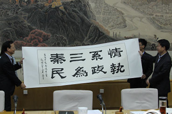 為了表示對(duì)省政府的謝意,我校學(xué)生特意創(chuàng)作了一幅“情系三秦,執(zhí)政為民”的書法作品,贈(zèng)送給孟軍。