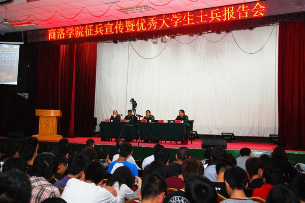青春獻國防,建功在軍營。為促進我校學生對大學生參軍入伍相關(guān)政策和知識的了解,鼓勵青年大學生投身國防建設(shè),5月7日,我校召開2014年征集大學生士兵政策宣講暨優(yōu)秀大學生軍人事跡報告會。校黨委副書記左曉民、商洛軍分區(qū)政委張永忠、商州區(qū)武裝部政委張翔、副部長劉永凱、商洛軍分區(qū)征兵辦公室科長沈禮軍出席會議,全體輔導員及學生代表400余人參加了會議。會議由商州區(qū)武裝部政委張翔主持。
