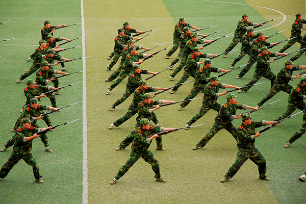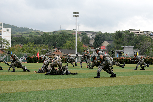 伴隨著著激昂奮進(jìn)的《檢閱進(jìn)行曲》,校長劉建林檢閱了軍訓(xùn)團(tuán)全體學(xué)生。軍訓(xùn)團(tuán)各連組成24個(gè)受閱方陣,以嚴(yán)整的軍容軍姿依次通過主席臺(tái)。同學(xué)們口號(hào)嘹亮、動(dòng)作整齊、步伐穩(wěn)健、英姿颯爽,充分展現(xiàn)了我校學(xué)生的精神風(fēng)貌。今年的分列式增加了持槍方陣、刺刀方陣、衛(wèi)生兵方陣和海軍方陣,具有更強(qiáng)的視覺效果和沖擊力。分列式結(jié)束后,我校學(xué)生進(jìn)行了刺殺操、花樣隊(duì)列和軍體拳匯報(bào)表演。男子刺殺操動(dòng)作整齊利落、殺氣騰騰,展示了壓倒一切敵人的英雄氣概;由600人表演的軍體拳節(jié)奏分明、套路連貫、氣勢磅礴、喊殺聲震天,贏得了現(xiàn)場陣陣熱烈的掌聲。軍訓(xùn)教官也進(jìn)行了精彩的單兵班排戰(zhàn)術(shù)和擒敵拳表演,將大會(huì)氣氛推向了高潮。