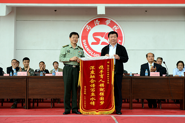 為增進(jìn)兩校之間的友誼,黨委書記張景書代表我校向西安政治學(xué)院贈(zèng)送了“攜手育人鑄就強(qiáng)國夢(mèng),深度融合譜寫魚水情”的錦旗。大會(huì)結(jié)束后,校長劉建林專程慰問了全體承訓(xùn)官兵,并與黨委副書記左曉民一起陪同趙歲步副院長和楊定友大校參觀了我校校園。