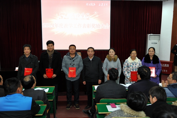 12月25日下午,我校隆重召開2014年度教學(xué)工作表彰獎(jiǎng)勵(lì)大會(huì),對(duì)本年度教學(xué)工作表現(xiàn)突出的集體和個(gè)人予以表彰獎(jiǎng)勵(lì),為省級(jí)本科教學(xué)工程項(xiàng)目授牌。校領(lǐng)導(dǎo)張景書、劉建林、左曉民、王思懷出席會(huì)議。大會(huì)由副校長(zhǎng)魏書堂主持。各院(部)、各系、各實(shí)驗(yàn)中心負(fù)責(zé)人,教學(xué)秘書及青年教師,學(xué)校辦公室、干部人事處、宣傳部、校團(tuán)委、學(xué)生處、招生就業(yè)處,形勢(shì)政策教研室、職業(yè)生涯規(guī)劃與就業(yè)指導(dǎo)教研室、心理健康教研室、國防與安全教育教研室負(fù)責(zé)人參加了表彰大會(huì)。