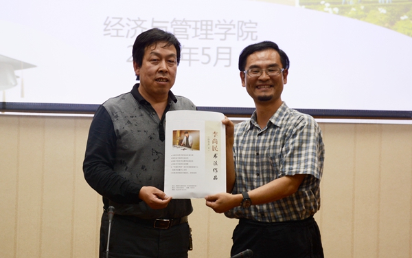 樊景博教授向兩位博士贈送了以經(jīng)管學院辦學理念“經(jīng)世致用、管控未來”為內(nèi)容、由我校圖書館館長李尚民揮毫潑墨的書法作品。