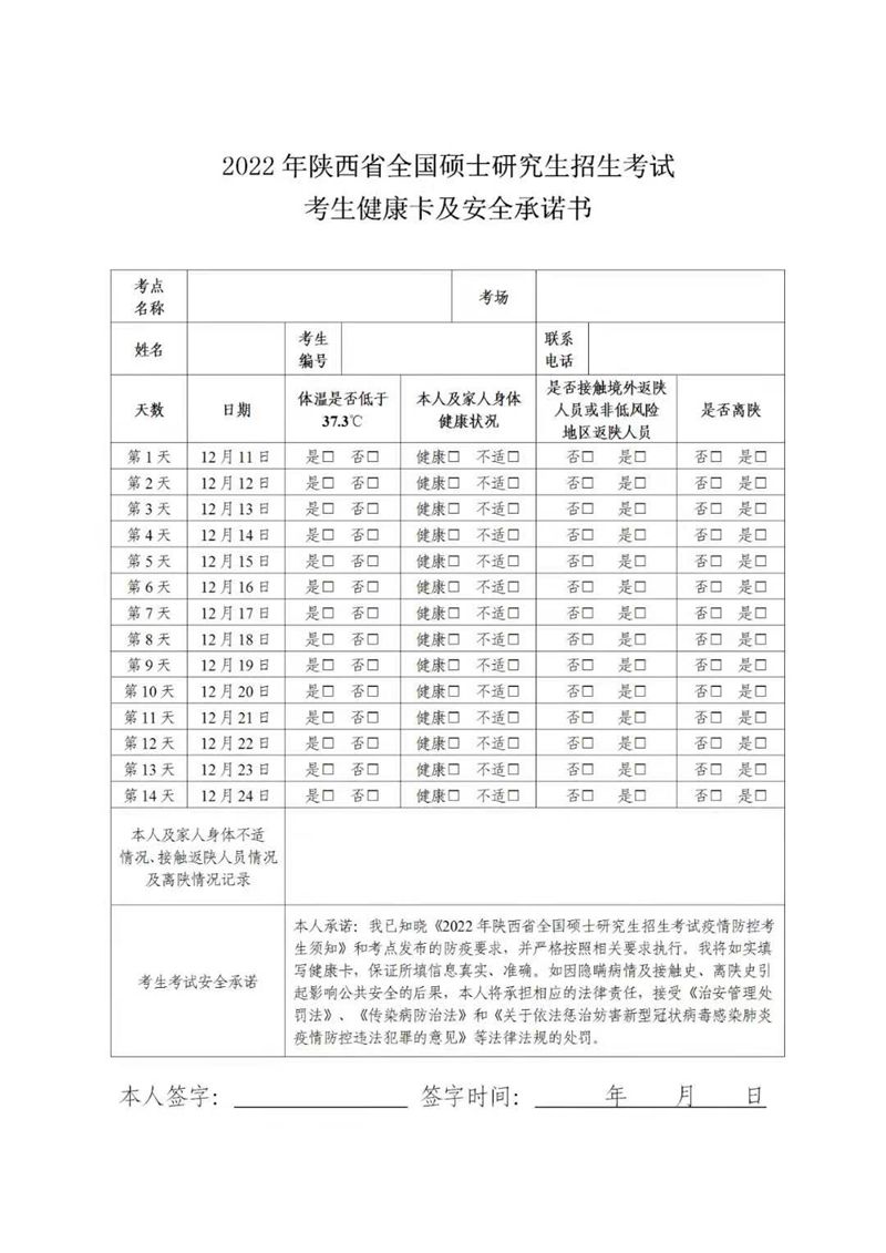 (可點(diǎn)擊原文進(jìn)入官網(wǎng),查看下載附件“2022年陜西省全國碩士研究生招生考試考生健康卡及安全承諾書”)
