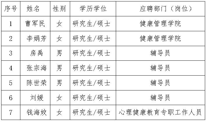 根據(jù)陜西省人社廳《關(guān)于陜西省事業(yè)單位公開(kāi)招聘人員辦法》規(guī)定及《商洛學(xué)院2019年人才招聘計(jì)劃》,經(jīng)過(guò)資格審查、試講(筆試)、專家面試等環(huán)節(jié)考察,并經(jīng)院長(zhǎng)辦公會(huì)2019年3月28日研究,同意招聘曹軍民等7位同志來(lái)我校工作,現(xiàn)予以公示。如有異議,請(qǐng)于2019年4月1日前向人事處或監(jiān)察室反映。