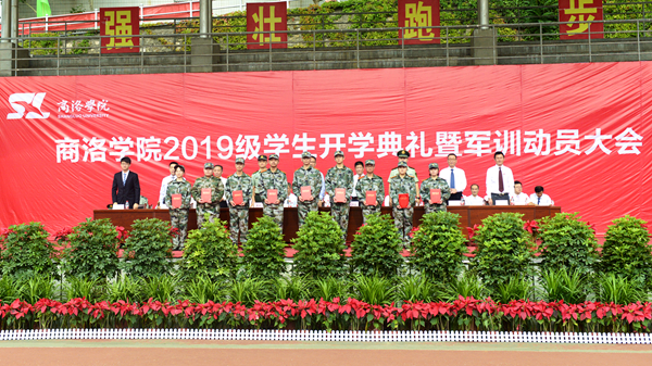 天朗氣清、秋風送爽,巍巍學府、德渥群芳。9月5日上午,我校2019級學生開學典禮暨軍訓動員大會在學校體育場隆重舉行。黨委書記龍治剛、校長范新會、紀委書記王思懷、黨委副書記彭虎軍,副校長劉寶盈、劉勇,商州區(qū)人民武裝部部長曹建明上校,武警商洛支隊副參謀長、軍訓團團長呂喆中校,2015屆校友、第44屆世界技能大賽銅獎獲得者、中航工業(yè)陜西飛機制造公司職工高雨楠出席大會。各二級學院(部)黨政主要負責人、有關職能部門負責人,2019級全體新生及家長代表參加大會。大會由彭虎軍主持。