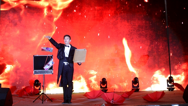 現(xiàn)場(chǎng)氣氛熱烈、座無虛席,晚會(huì)在熱情歡快的民樂合奏《龍騰虎躍》中拉開了帷幕。16個(gè)節(jié)目以歌曲、魔術(shù)、舞蹈、小品、朗誦、武術(shù)、器樂演奏等形式依次呈現(xiàn),內(nèi)容豐富、精彩紛呈。其中,活力健身操《瀟灑小姐》動(dòng)感十足、青春洋溢,展現(xiàn)了商院學(xué)子朝氣蓬勃、自信向上的精神風(fēng)貌;小品《青年黨員有作為》講述了大學(xué)生黨員響應(yīng)國家號(hào)召,主動(dòng)回歸基層,助力鄉(xiāng)村振興的動(dòng)人故事;歌曲《我們的時(shí)光》帶我們翻過青山,感受海風(fēng)拂過椰樹的溫柔;漢服舞蹈《紙扇書生》以翩若仙鶴的舞步展現(xiàn)出書生的瀟灑風(fēng)姿;朗誦《晨光夕憶》聲情并茂,憶往昔革命初心,暢想火紅的中國夢(mèng);舞蹈《排舞》活力四射,將現(xiàn)場(chǎng)氣氛推向高潮。