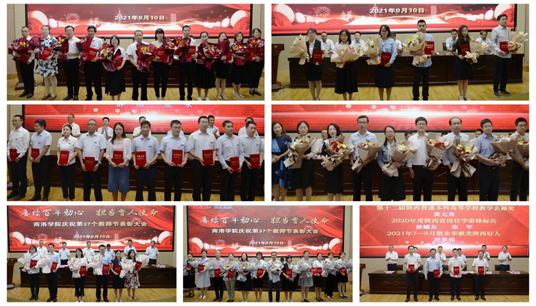 大會(huì)對(duì)我校2021年先進(jìn)集體、2020年度目標(biāo)責(zé)任考核先進(jìn)單位,榮獲陜西省教學(xué)名師、2020年度陜西省崗位學(xué)雷鋒標(biāo)兵、2021年7—8月敬業(yè)奉獻(xiàn)類陜西好人的教師,及我校2021年優(yōu)秀教師、2021年優(yōu)秀教育工作者、“我最喜愛的老師”、學(xué)生工作、科技工作及教學(xué)工作榮譽(yù)獲得者進(jìn)行了表彰。伴隨著輕松歡快的背景音樂和電子屏幕不斷滾動(dòng)著的表彰名單,受表彰的集體和個(gè)人代表邁著矯健的步伐先后走上主席臺(tái),從校領(lǐng)導(dǎo)手中接過獎(jiǎng)牌和榮譽(yù)證書。校領(lǐng)導(dǎo)與受表彰的教師們親切握手、合影留念。學(xué)生代表上臺(tái)為受表彰的教師們送上鮮花和誠摯的祝福,感謝老師們的教育之恩和培育之情。
