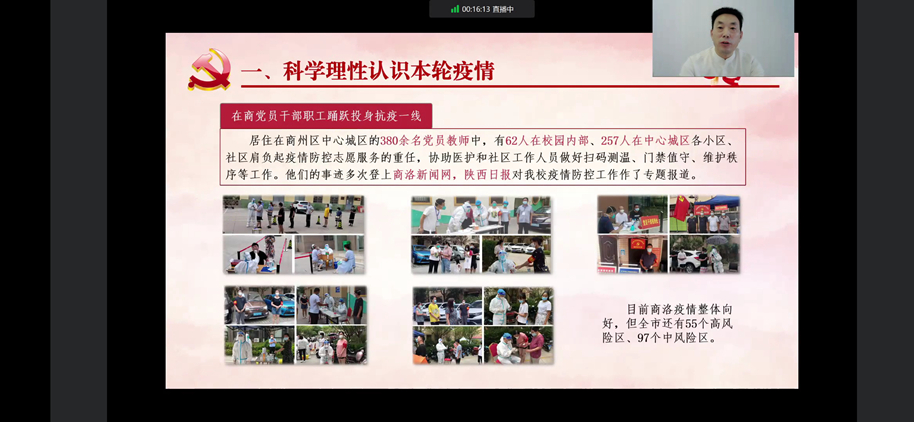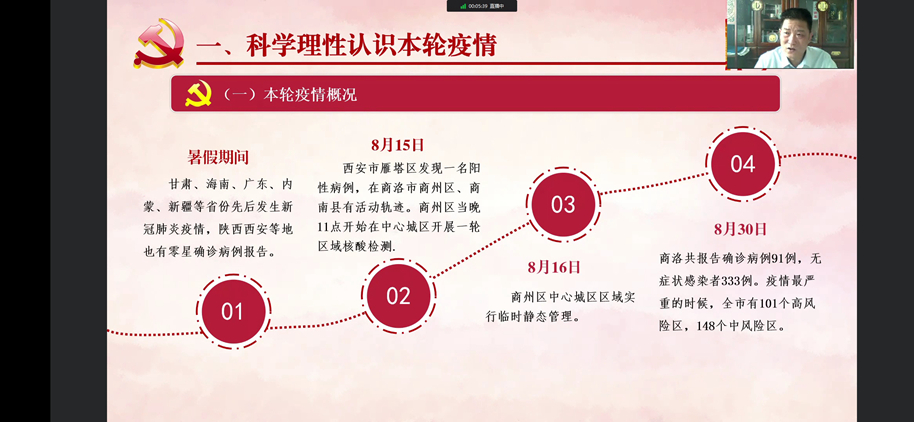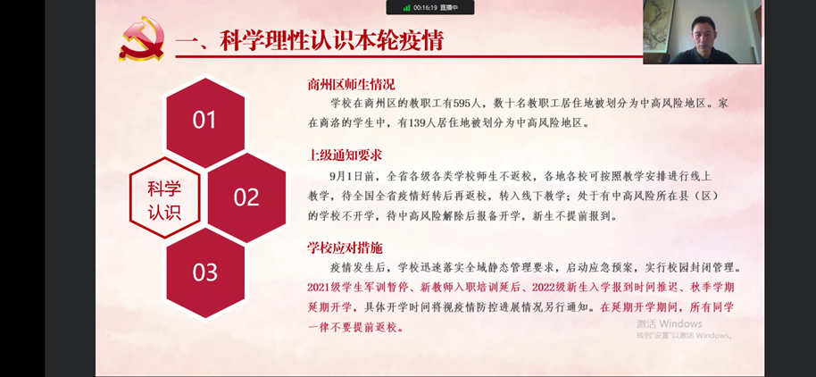 為深化大學(xué)生思想政治教育,強化師生疫情防控意識,引導(dǎo)廣大青年學(xué)生嚴(yán)格落實疫情防控各項工作要求,弘揚偉大抗疫精神,以實際行動迎接黨的二十大勝利召開,8月31日下午,校領(lǐng)導(dǎo)張志昌、范新會、彭虎軍、劉勇、劉寶盈、王新軍、郭瑾以“云端授課”的形式,為全體學(xué)生講授“開學(xué)第一課”。