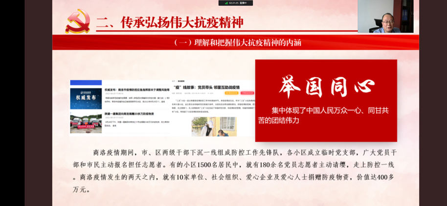 校長范新會在講授中引用多個鮮活事例,生動形象地闡述了生命至上、舉國同心、舍生忘死、尊重科學(xué)、命運與共的偉大抗疫精神內(nèi)涵,系統(tǒng)性總結(jié)了中國戰(zhàn)“疫”取得的偉大成就。結(jié)合近期國內(nèi)、我省和商州區(qū)等疫情防控形勢,范新會強調(diào),青年學(xué)生要深刻理解和傳承弘揚偉大抗疫精神,把握偉大抗疫精神的內(nèi)涵。一是要肩負(fù)使命擔(dān)當(dāng),與祖國和人民同呼吸共命運。青年學(xué)生要把學(xué)問做在祖國大地上,做接地氣的真學(xué)問,要到祖國和人民最需要的地方去摸爬滾打,在疫情防控、科技創(chuàng)新、鄉(xiāng)村振興中發(fā)光發(fā)熱,從中找到人生真諦、生命價值和事業(yè)方向。二是要厚植愛國情懷,做積極戰(zhàn)“疫”的先行者。青年學(xué)生要帶頭遵守疫情防控各項要求,主動傳播疫情防控權(quán)威信息,分享正能量抗疫故事,解讀疫情防控方針政策。要敢于挺身而出,發(fā)揮所長、盡己所能為防控工作助力。要服從組織安排,落實安全防護,規(guī)范有序參與疫情防控志愿服務(wù),在筑牢校園、社區(qū)防疫屏障中,展現(xiàn)商洛學(xué)院人應(yīng)有的昂揚斗志和青春力量。