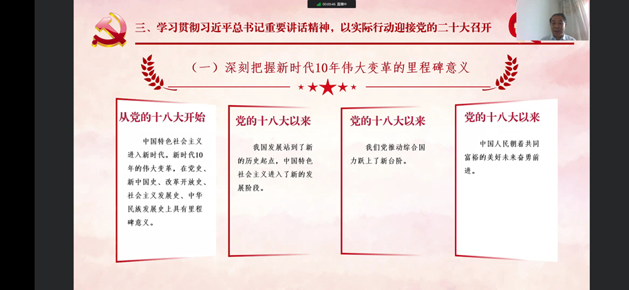 張志昌強調(diào),黨的二十大即將于10月份召開,這是在進入全面建設(shè)社會主義現(xiàn)代化國家新征程的關(guān)鍵時刻召開的一次十分重要的大會,將科學(xué)謀劃未來5年乃至更長時期黨和國家事業(yè)發(fā)展的目標(biāo)任務(wù)和大政方針,事關(guān)黨和國家事業(yè)繼往開來,事關(guān)中國特色社會主義前途命運,事關(guān)中華民族偉大復(fù)興。作為青年學(xué)生,一是要堅定理想信念,主動“扣好人生的第一??圩印?,自覺做社會主義核心價值觀的堅定信仰者、積極傳播者、模范踐行者,堅決聽黨指揮跟黨走,把對黨忠誠、對人民的熱愛始終牢記在心中、落實到行動中。二是要強化理論武裝,及時跟進學(xué)習(xí),始終在政治立場、政治方向、政治原則、政治道路上同以習(xí)近平同志為核心的黨中央保持高度一致,堅定不移沿著習(xí)近平總書記指引的道路奮勇前進。三是要增強實踐本領(lǐng),堅持學(xué)以致用,積極參加創(chuàng)新創(chuàng)業(yè)實踐,拓寬學(xué)習(xí)領(lǐng)域、優(yōu)化知識結(jié)構(gòu),培養(yǎng)創(chuàng)新意識、提高創(chuàng)新能力。