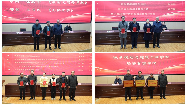 大會表彰了我校2023年教育教學研討會優(yōu)秀論文、優(yōu)秀組織單位、陜西省高等教育優(yōu)秀教材獎、陜西高校創(chuàng)新創(chuàng)業(yè)課程、第二批陜西省課程思政示范課程、陜西本科教育教學改革研究項目、第五屆陜西本科高校教師教學創(chuàng)新大賽、陜西高校思政課程課程思政“大練兵”省級展示活動獲獎教師。