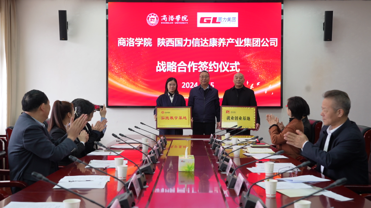在其他與會人員的見證下,王新軍與林杰分別代表校企雙方簽訂《陜西國力信達(dá)康養(yǎng)產(chǎn)業(yè)集團(tuán)有限公司商洛學(xué)院戰(zhàn)略合作框架協(xié)議》。劉寶盈代表學(xué)校為國力集團(tuán)授《商洛學(xué)院就業(yè)創(chuàng)業(yè)基地》《商洛學(xué)院實踐教學(xué)基地》牌,朱啟有、李萌分別代表企業(yè)接牌。
