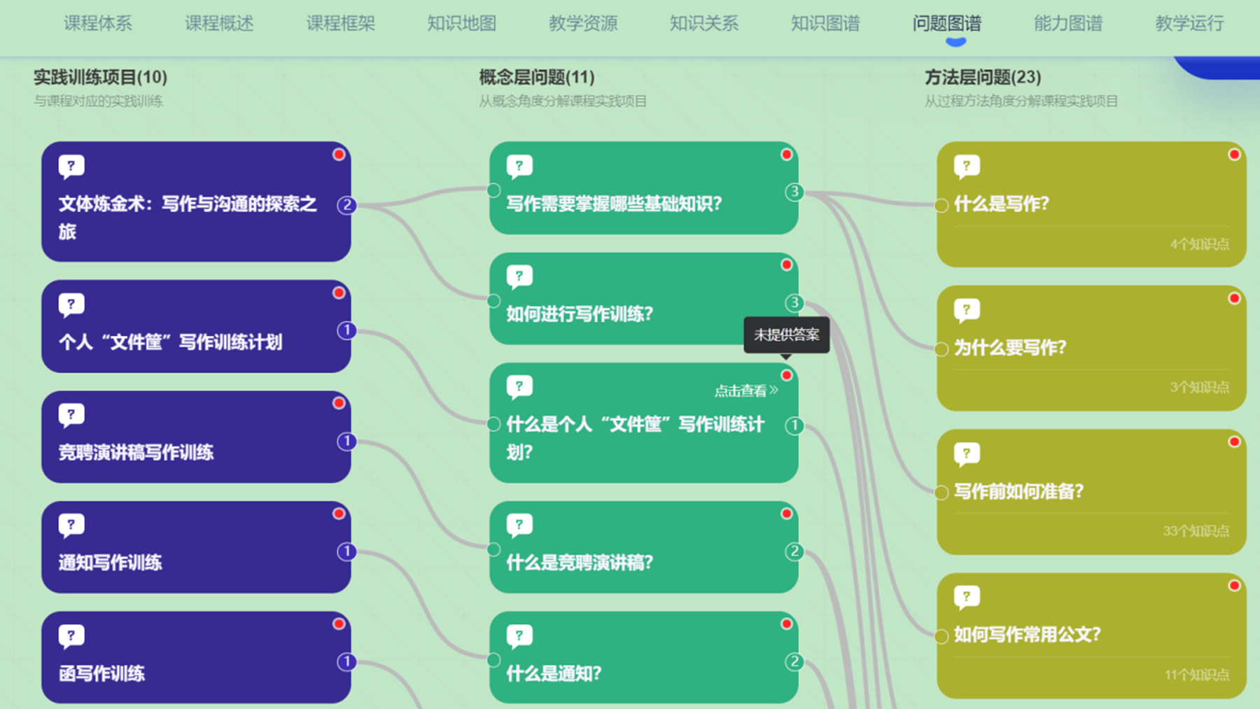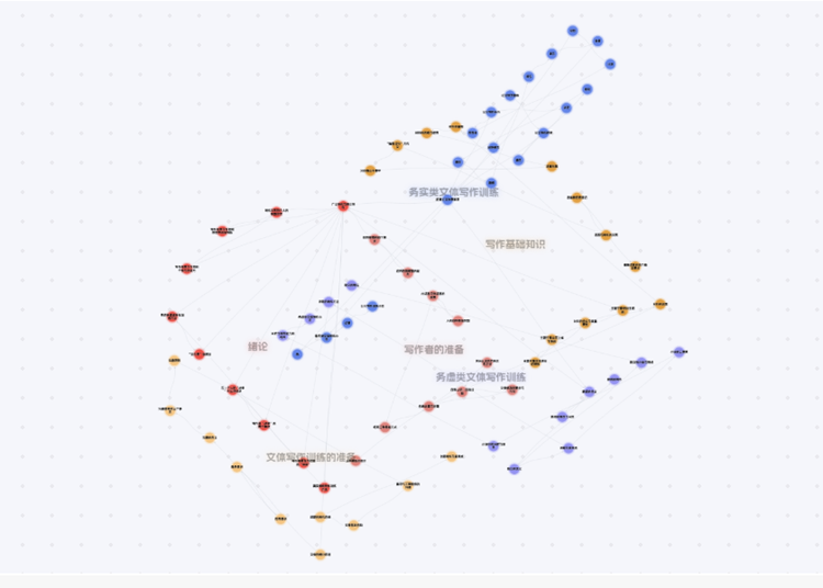 與傳統(tǒng)的視頻課程資源建設(shè)相比,知識(shí)圖譜課程更加智慧化、數(shù)智化,將可視化的課程體系呈現(xiàn)給師生,幫助教師在教學(xué)中更好地服務(wù)學(xué)生。課程采用工作情景模擬和角色意識(shí)提升的方法,將寫(xiě)作理論置于實(shí)際情境中,以溝通為寫(xiě)作核心,設(shè)計(jì)具有挑戰(zhàn)性的任務(wù)和項(xiàng)目,凸顯課程兩大特點(diǎn):學(xué)法創(chuàng)新——寫(xiě)作“文件筐”訓(xùn)練法強(qiáng)化學(xué)生自我管理;成果導(dǎo)向——加深學(xué)生學(xué)習(xí)過(guò)程體驗(yàn),提升其寫(xiě)作能力與溝通能力。同時(shí),引入教育教學(xué)AI,將現(xiàn)有的課程資源進(jìn)行碎片化再利用,給學(xué)生更多的學(xué)習(xí)資源選擇和路徑選擇。學(xué)生可基于知識(shí)點(diǎn)及關(guān)鍵詞,使用AI檢索教學(xué)資源;教師可利用AI技術(shù),分析學(xué)生的學(xué)習(xí)行為和學(xué)習(xí)結(jié)果,綜合判斷學(xué)生對(duì)知識(shí)點(diǎn)的掌握度,更加精準(zhǔn)地掌握學(xué)情,實(shí)現(xiàn)更好地“備學(xué)生”。