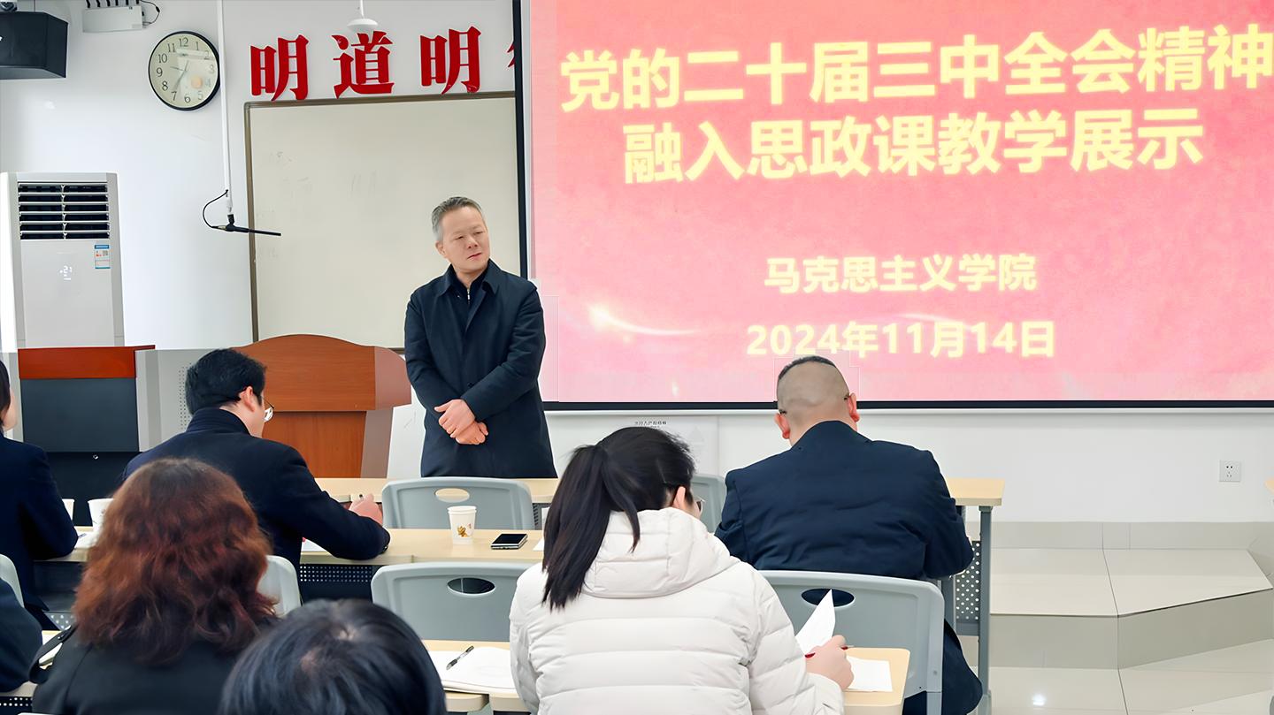 教學(xué)展示中,馬克思主義學(xué)院楊增強教授圍繞全會精神的理解、融入思政課的對接點和方式方法作了輔導(dǎo)報告。青年教師劉健、王曉霞、朱琳分別以《為什么全過程人民民主超越了西方民主》《順勢而為:加快發(fā)展新質(zhì)生產(chǎn)力》《特色產(chǎn)業(yè)助力鄉(xiāng)村振興》為題,開展了形勢與政策、習(xí)近平新時代中國特色社會主義思想概論等課程的模擬教學(xué)。