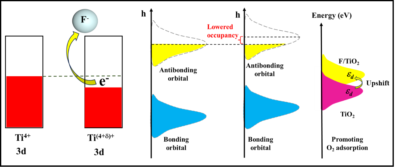 該研究指出,金屬的d帶能級(jí)高低決定了催化劑表面活性位點(diǎn)對(duì)小分子物質(zhì)的吸附強(qiáng)度,能級(jí)越高,催化劑對(duì)小分子物質(zhì)的吸附能力越強(qiáng)。該研究通過(guò)F摻雜提升TiO2的d帶中心,提高了TiO2對(duì)O2的吸附性能,從而增強(qiáng)了TiO2光催化產(chǎn)H2O2的活性。