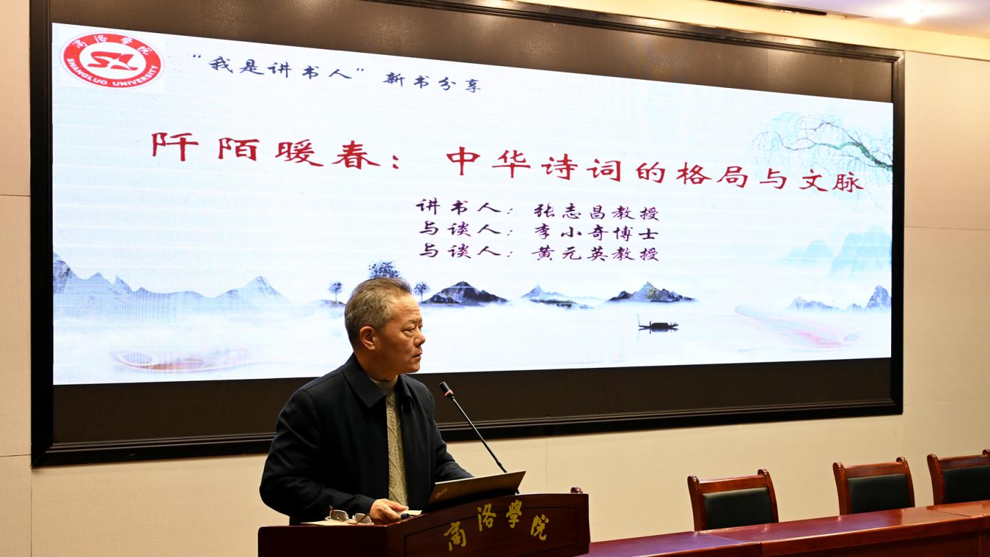 在新書(shū)分享環(huán)節(jié),張志昌教授和黃元英教授分別分享了《阡陌暖春:中華詩(shī)詞的格局與文脈》和《商州記憶》兩部新著?!囤淠芭海褐腥A詩(shī)詞的格局與文脈》通過(guò)帶領(lǐng)讀者游覽中國(guó)詩(shī)詞的長(zhǎng)河,幫助讀者用心體悟中國(guó)詩(shī)詞的藝術(shù)之美、精神之美、境界之美,幫助讀者切實(shí)感受到歷代詩(shī)人的家國(guó)情懷與人文關(guān)懷,讓讀者捧卷徜徉于美輪美奐的詩(shī)詞叢林之時(shí),享受到詩(shī)意地棲居于華夏暖春的幸福?!渡讨萦洃洝吠ㄟ^(guò)跨越歷史時(shí)空的心靈對(duì)話,抒發(fā)了秦嶺人對(duì)秦嶺魂?duì)繅?mèng)縈的鄉(xiāng)愁。張文諾教授、薛璞喆博士分別從著作的文學(xué)魅力、文化意義以及歷史美學(xué)視角對(duì)《商州記憶》進(jìn)行了精彩深刻的評(píng)述。李小奇博士和黃元英教授立足個(gè)人視角分別從引發(fā)讀者共情的章節(jié)及觀點(diǎn)、學(xué)術(shù)價(jià)值思考等方面對(duì)《阡陌暖春:中華詩(shī)詞的格局與文脈》展開(kāi)了賞析。