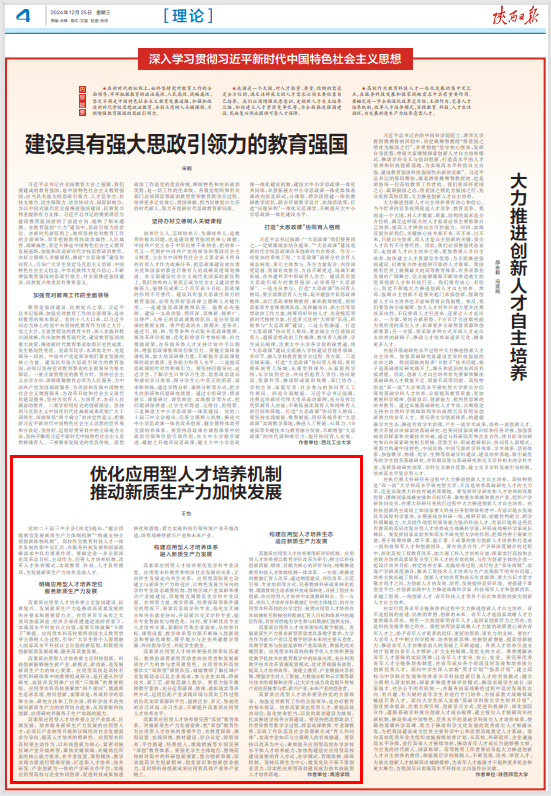 12月25日,《陜西日報(bào)》“理論”版面刊發(fā)了我校王怡教授以《優(yōu)化應(yīng)用型人才培養(yǎng)機(jī)制 推動新質(zhì)生產(chǎn)力加快發(fā)展》為題的署名文章,文章結(jié)合我校辦學(xué)實(shí)際和校地協(xié)同發(fā)展經(jīng)驗(yàn),深入剖析了高校在教育科技人才一體化發(fā)展背景下,如何培養(yǎng)高素質(zhì)應(yīng)用型人才,為新質(zhì)生產(chǎn)力加快發(fā)展貢獻(xiàn)更多力量。