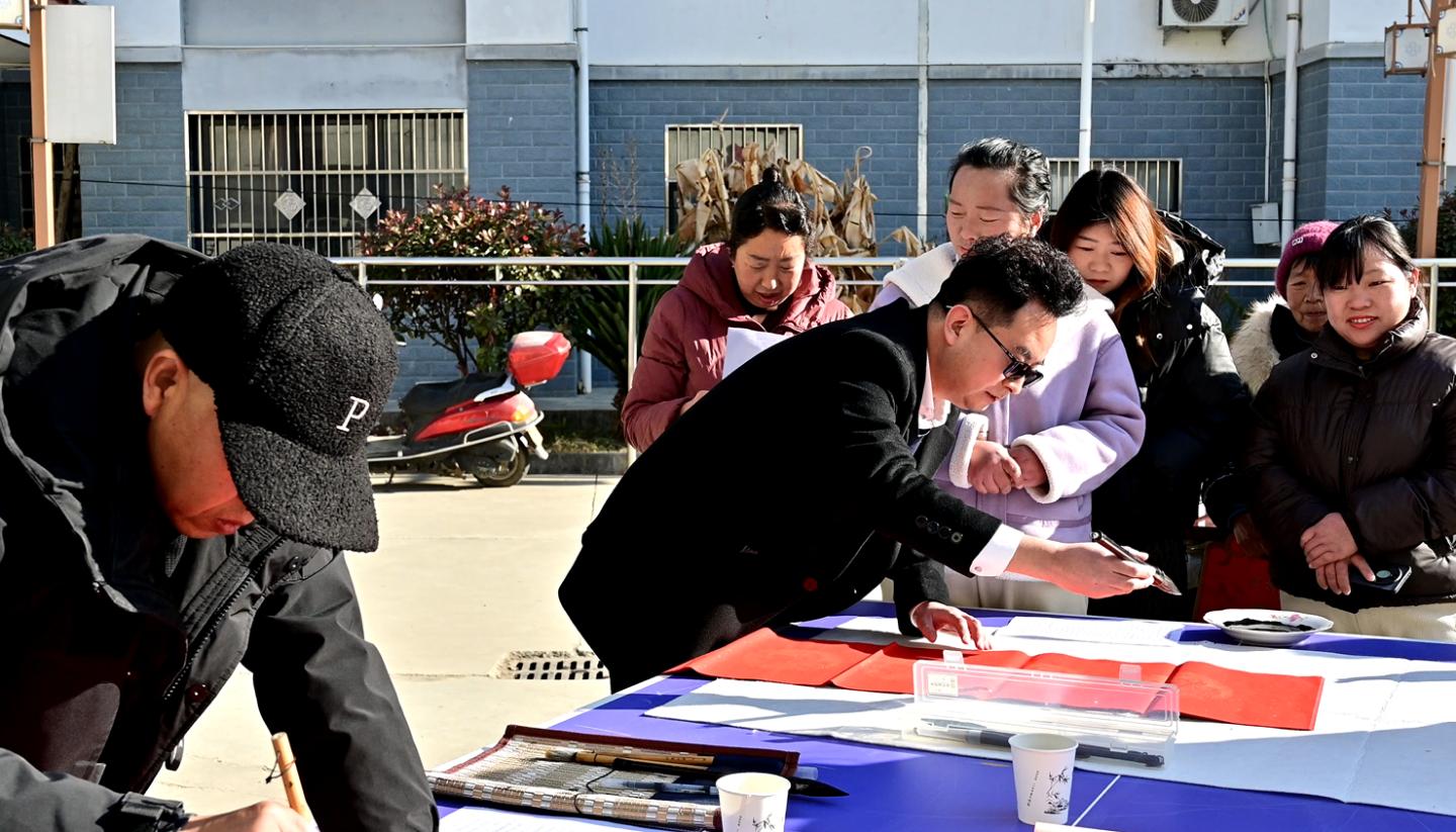 會(huì)后,權(quán)雅寧一行在縣鎮(zhèn)村干部陪同下,走訪慰問村民家庭,詳細(xì)了解他們的生產(chǎn)生活狀況,并送去新春祝福與慰問品。與此同時(shí),藝術(shù)學(xué)院教師在村委會(huì)廣場現(xiàn)場揮毫,為村民書寫春聯(lián),送去濃濃年味與文化溫暖。