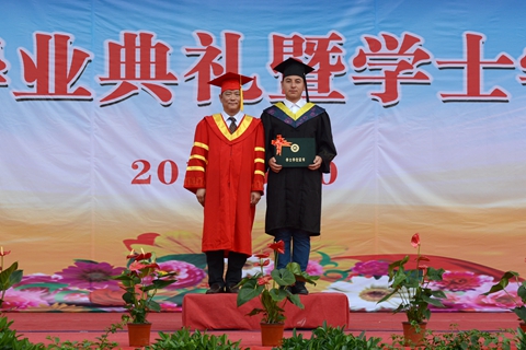 在學(xué)士學(xué)位授予儀式上,畢業(yè)生們依次走上主席臺,劉建林、范新會、彭虎軍分別為獲得學(xué)士學(xué)位的畢業(yè)生正冠撥蘇、頒發(fā)學(xué)位證書,并與他們一一合影留念。