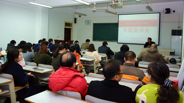 12月5日晚,校黨委委員高榮發(fā)到藝術(shù)學(xué)院宣講黨的十九大精神。宣講會由藝術(shù)學(xué)院黨總支書記黃新春主持。