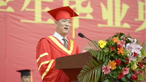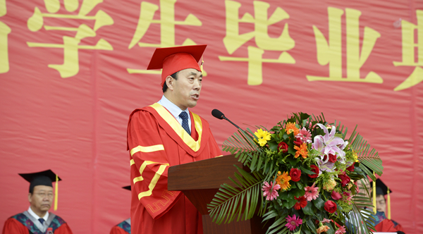 校長范新會以《不忘初心 砥礪奮進 做新時代的奮斗者》為題發(fā)表了情真意切的講話。他深情地說,“母?!笔且粋€溫暖而幸福的字眼,是世界上最質(zhì)樸的一種情結,是最為珍貴的人生記憶。過去的四年,學校事業(yè)蓬勃發(fā)展,蒸蒸日上。你們與學校共同成長、共同進步,追求理想,砥礪前行,在這里磨礪了意志,增長了才干。你們用奮斗點亮了大學時光,為學校贏得了無數(shù)榮譽,你們的拼搏精神和青春故事已經(jīng)深深地鐫刻在母校的記憶里!在這依依惜別的時刻,母校和老師對你們不舍再見,更為你們感到驕傲!
