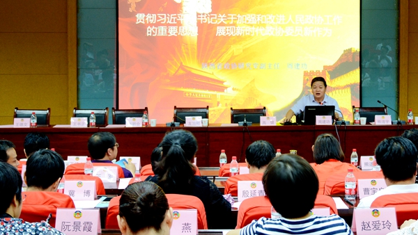 省政協(xié)研究室副主任周建功以《貫徹習(xí)近平總書記關(guān)于加強(qiáng)和改進(jìn)人民政協(xié)工作的重要思想展現(xiàn)新時(shí)代政協(xié)委員新作為》為題為與會(huì)人員作專題輔導(dǎo)報(bào)告,他在報(bào)告中詳細(xì)解讀了習(xí)近平總書記關(guān)于加強(qiáng)和改進(jìn)人民政協(xié)工作的重要思想,全面回顧了人民政協(xié)69年的光輝發(fā)展歷程,并就政協(xié)章程的修改、政協(xié)的十項(xiàng)經(jīng)常性工作、政協(xié)委員履職的基本要求等幾個(gè)方面作了深入系統(tǒng)的講解。