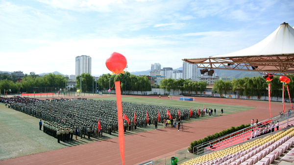 未覺池塘春草夢(mèng),階前梧葉已秋聲。9月7日上午,我校2018級(jí)學(xué)生開學(xué)典禮暨軍訓(xùn)動(dòng)員大會(huì)在學(xué)校體育場(chǎng)隆重舉行。校長(zhǎng)范新會(huì)、紀(jì)委書記王思懷、副校長(zhǎng)魏書堂、黨委副書記彭虎軍,副校長(zhǎng)劉寶盈、劉勇,武警商洛支隊(duì)副參謀長(zhǎng)、軍訓(xùn)團(tuán)團(tuán)長(zhǎng)呂喆少校,武警商洛支隊(duì)執(zhí)勤一大隊(duì)大隊(duì)長(zhǎng)、軍訓(xùn)團(tuán)副團(tuán)長(zhǎng)郭偉少校,2005屆校友、藍(lán)田縣湯峪鎮(zhèn)高堡初級(jí)中學(xué)校長(zhǎng)吳楠出席大會(huì)。各二級(jí)學(xué)院(部)黨政主要負(fù)責(zé)人、有關(guān)職能部門負(fù)責(zé)人及3500余名2018級(jí)新生參加大會(huì)。大會(huì)由彭虎軍主持。
