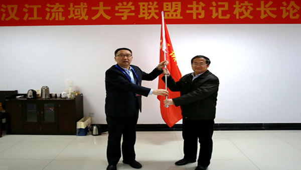 在論壇上,龍治剛向2019年漢江流域聯(lián)盟輪值理事長單位湖北汽車工業(yè)學(xué)院授旗,湖北汽車工業(yè)學(xué)院校長鐘毓寧接旗。