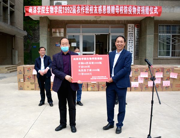 4月22日,我校生物學(xué)院92屆校友向母校捐贈(zèng)價(jià)值10萬元的防疫物資。校長(zhǎng)范新會(huì),副校長(zhǎng)王新軍,校友代表、洛南縣委副書記馬建琦及西安方爾貿(mào)易有限公司總經(jīng)理林建軍出席在學(xué)校舉行的捐贈(zèng)儀式。院長(zhǎng)辦公室、生物學(xué)院負(fù)責(zé)人,教師代表,生物學(xué)院農(nóng)作班92屆部分校友參加捐贈(zèng)儀式。