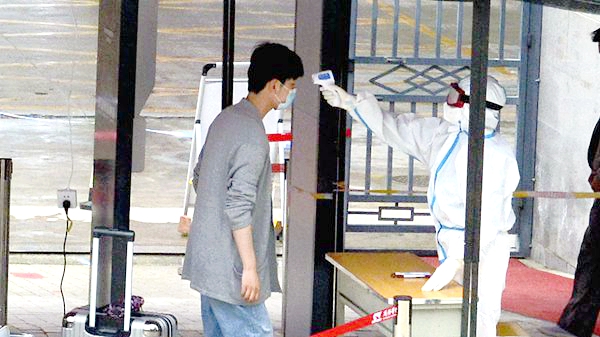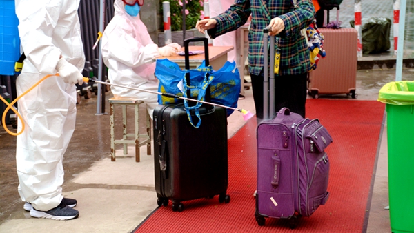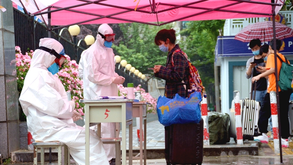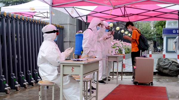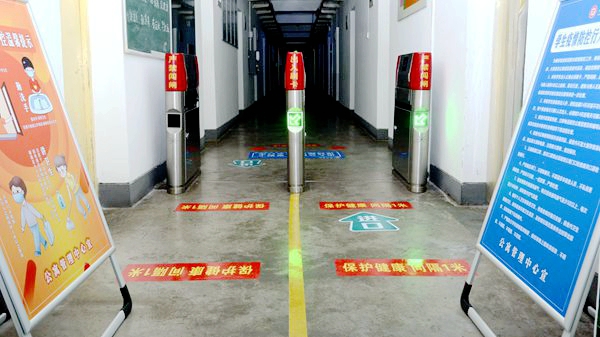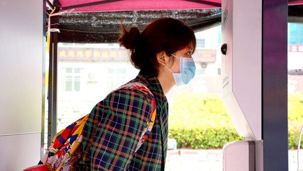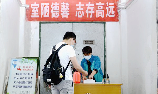 校門口,工作人員引導報到學生有序通過測溫通道、消殺區(qū)、身份核驗區(qū)、掃碼報到區(qū)、院系學生報到處,對學生行李就地進行全面消毒、更換口罩、測量體溫、核驗健康綠碼和身份證明、簽訂返校承諾書,依次完成開學報到各個項目步驟后,學生在輔導員、聯(lián)絡教師的陪同下,保持安全距離,前往各自所在的公寓樓,經(jīng)公寓管理人員測溫、手部消毒、信息登記后,領取出入證進入宿舍。