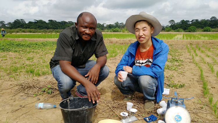 張軍(右)在喀麥隆深入田間開展農(nóng)業(yè)技術(shù)示范推廣