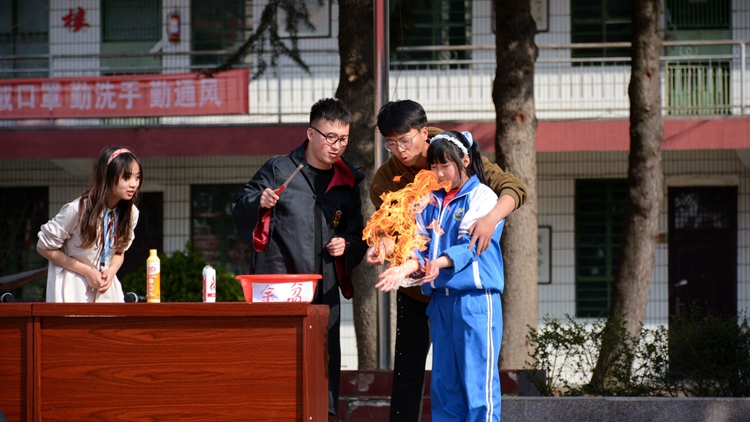 在科技展品體驗環(huán)節(jié),我校學(xué)生志愿者為寺坪鎮(zhèn)中小學(xué)生展示并講解了前后移動的平衡小車、炫目震撼的摩天大樓、動聽優(yōu)雅的音樂噴泉、精準(zhǔn)巧妙的迷你電子秤等30余件原創(chuàng)科技作品,以通俗易懂的方式講授了這些作品的科學(xué)原理。在趣味實驗展演環(huán)節(jié),我校志愿者演示了會跑的易拉罐、會飛的章魚、會游泳的雞蛋、會吹氣球的瓶子、彩色的密度塔、噴火的神掌、親手制作的汽水等科普作品,展示了奇妙現(xiàn)象背后的科學(xué)奧秘,激發(fā)了中小學(xué)生探索科學(xué)知識的興趣。在航模飛行展示環(huán)節(jié),校航模隊成員進行了“紙飛機”“穿越機”兩種機型的航模飛行表演和“花樣穿越”技能表演,引來參觀學(xué)生的陣陣歡呼,場面一度熱鬧非凡。
