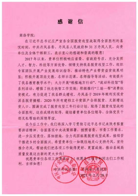 日前,中共丹鳳縣委、丹鳳縣人民政府向我校發(fā)來感謝信,代表31萬丹鳳人民對我校在丹鳳縣開展結對幫扶工作、支持幫助丹鳳縣取得脫貧攻堅全面勝利致以誠摯的感謝。