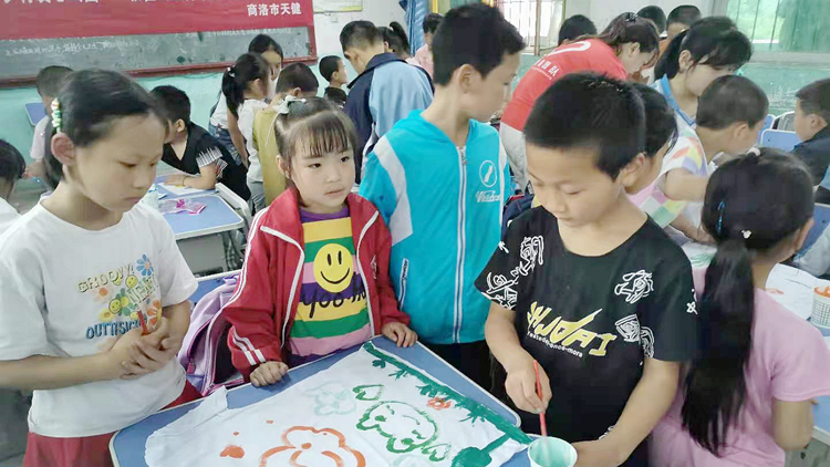 活動中,師生為該校留守兒童贈送了圖畫本、鉛筆、橡皮等繪畫用品。向小朋友們展示了校藝術(shù)學(xué)院學(xué)生制作的泥塑、石頭畫、剪紙拼畫、電腦繪畫等美術(shù)作品,拓展了小朋友們的審美視野,增強(qiáng)了大家的邏輯思維與形象思維能力,激發(fā)了大家熱愛美、發(fā)現(xiàn)美、追求美的熱情。師生還進(jìn)行了“T恤衫彩繪”現(xiàn)場學(xué)創(chuàng)實(shí)踐,用美術(shù)實(shí)踐與T恤衫繪畫相結(jié)合的教學(xué)方式,鼓勵和引導(dǎo)小朋友們嘗試多樣思維和多元表現(xiàn),進(jìn)一步增強(qiáng)了大家的實(shí)踐創(chuàng)作能力。在我校師生一對一、手把手的耐心講解與悉心指導(dǎo)下,每個(gè)小朋友都獨(dú)立完成了精美的美術(shù)作品。
