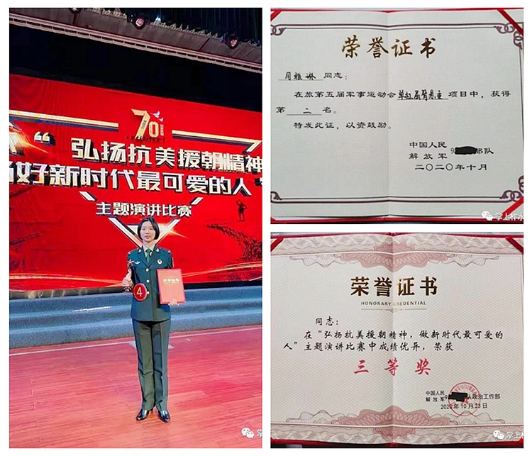 周雅琳從小就有一顆熾熱的軍人夢(mèng),2019年她積極響應(yīng)國(guó)家號(hào)召,踴躍應(yīng)征入伍,現(xiàn)為火箭軍某部戰(zhàn)士。在部隊(duì)上,她認(rèn)真工作,嚴(yán)格按照標(biāo)準(zhǔn)完成各項(xiàng)任務(wù),積極參加各項(xiàng)活動(dòng),參加單位“弘揚(yáng)抗美援朝精神,當(dāng)好新時(shí)代最可愛(ài)的人”主題演講比賽,榮獲三等獎(jiǎng)。自主加強(qiáng)體能訓(xùn)練,參加軍事運(yùn)動(dòng)會(huì)單杠屈臂懸重項(xiàng)目,獲得第二名。參加春晚排練及慰問(wèn)演出等文藝活動(dòng),受到指導(dǎo)員和戰(zhàn)友們的一致肯定。同時(shí),她愛(ài)好樂(lè)器演奏,還是單位軍樂(lè)隊(duì)單簧管演奏員。