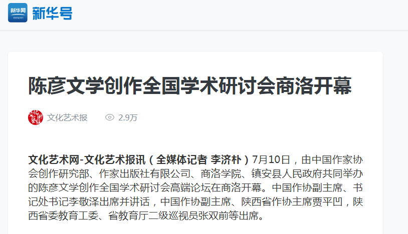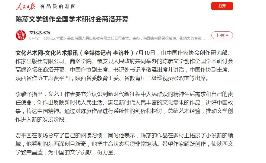 7月10日,由我校與中國作家協(xié)會創(chuàng)作研究部、作家出版社有限公司、鎮(zhèn)安縣人民政府聯(lián)合舉辦的陳彥文學創(chuàng)作全國學術研討會高端論壇在我校舉行。賈平凹、陳彥兩位著名商洛籍作家、茅盾文學獎獲得者及50余位國內(nèi)文學界專家、學者齊聚我校開展研討交流。人民號、新華號、學習強國、華商網(wǎng)、搜狐網(wǎng)、新浪網(wǎng)、中華網(wǎng)、騰訊網(wǎng)、今日頭條、西部網(wǎng)、中國作家網(wǎng)、西安晚報、文化藝術報、陜西作家網(wǎng)、西安新聞網(wǎng)、商洛新聞網(wǎng)等中央、省、市媒體對我校陳彥文學創(chuàng)作全國學術研討會高端論壇紛紛進行了報道。各類微信、微博等自媒體也紛紛報道和轉發(fā),使讀者進一步了解了陳彥的文學世界,陳彥的文學藝術也將在更廣闊的空間傳播,積極促進了商洛乃至陜西文學事業(yè)的繁榮發(fā)展,擴大了我校的知名度和影響力。