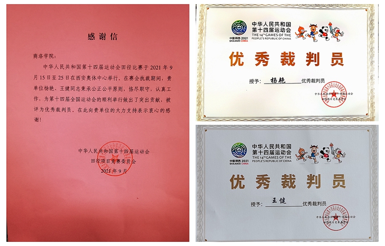 比賽期間,4位教師嚴(yán)格履行裁判員職責(zé),他們嚴(yán)肅認(rèn)真、公正準(zhǔn)確的裁判態(tài)度及專業(yè)的裁判能力,得到了十四運(yùn)競(jìng)賽委員會(huì)的充分肯定和高度贊賞。王健、楊艷獲評(píng)十四運(yùn)會(huì)優(yōu)秀裁判員。十四運(yùn)會(huì)田徑項(xiàng)目競(jìng)賽委員會(huì)還向我校發(fā)來(lái)感謝信,信中對(duì)我校的大力支持及王健、楊艷兩位教師為十四運(yùn)會(huì)順利舉辦所作出的突出貢獻(xiàn)表示了衷心的感謝。
