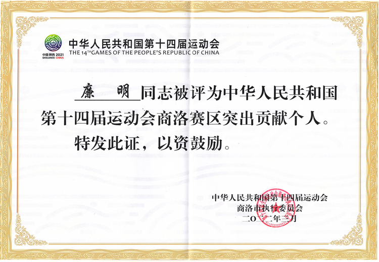 近日,第十四屆全國運動會商洛市執(zhí)行委員會發(fā)布了《關(guān)于第十四屆全國運動會商洛賽區(qū)籌辦工作情況的通報》(十四運發(fā)〔2022〕1號),我校榮獲十四運會商洛賽區(qū)籌辦工作“突出貢獻單位”榮譽,數(shù)計學院黨總支書記廉明(原團委副書記)榮獲十四運會商洛賽區(qū)籌辦工作“突出貢獻個人”榮譽稱號。