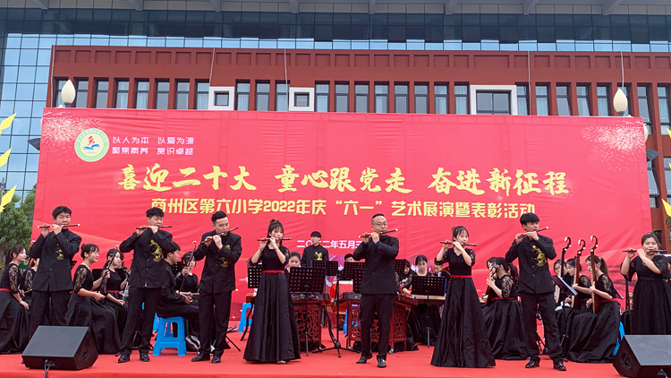 5月27日和31日,我校附屬小學(xué)和幼兒園分別舉辦了“喜迎二十大、共育花成長”和“喜迎二十大、童心跟黨走、奮進(jìn)新征程”主題藝術(shù)展演活動。副校長王新軍和學(xué)校發(fā)展規(guī)劃處、藝術(shù)學(xué)院負(fù)責(zé)人出席活動。藝術(shù)學(xué)院民族管弦樂團(tuán)為附屬小學(xué)師生表演了《象王行》《權(quán)御天下》《揚鞭催馬運糧忙》等民樂節(jié)目,共同歡慶孩子們的節(jié)日。