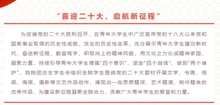 城鄉(xiāng)規(guī)劃與建筑工程學(xué)院舉辦了“喜迎黨的二十大,啟航新征程”活動(dòng),通過(guò)展現(xiàn)學(xué)生自行創(chuàng)作的黨的二十大題材文學(xué)、書(shū)畫(huà)、視頻、海報(bào)、攝影等文藝作品,充分展示了青年大學(xué)生奮進(jìn)新征程、建功新時(shí)代,勤奮篤學(xué)、積極向上的精神風(fēng)貌。
