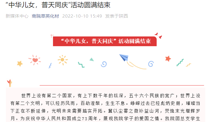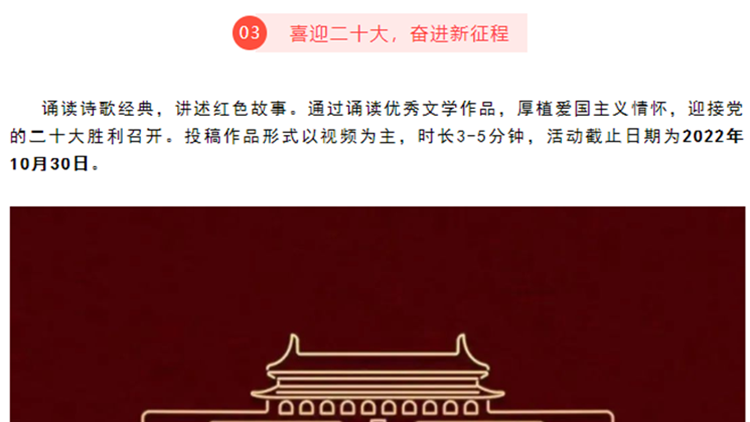 為深入開(kāi)展“青春獻(xiàn)禮黨的二十大,強(qiáng)國(guó)有我新征程”主題宣傳教育活動(dòng),熱烈慶祝中華人民共和國(guó)成立73周年,引導(dǎo)和激勵(lì)廣大師生厚植愛(ài)國(guó)主義情懷,營(yíng)造網(wǎng)絡(luò)文明新風(fēng),國(guó)慶節(jié)期間,我校組織開(kāi)展了豐富多彩的“喜迎黨的二十大 歡度國(guó)慶節(jié)”系列主題活動(dòng)。廣大師生通過(guò)各級(jí)各類(lèi)網(wǎng)絡(luò)平臺(tái)和線(xiàn)上活動(dòng),用自己的方式為祖國(guó)送上美好祝福,禮贊新時(shí)代奮進(jìn)征程,以良好的精神面貌和昂揚(yáng)姿態(tài)喜迎黨的二十大勝利召開(kāi)。