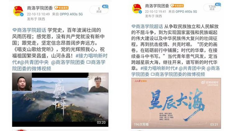“接力唱響新時代”微博接力活動通過發(fā)布歌唱視頻的方式參與微博話題。校團委組織藝術學院優(yōu)秀學子傾情演唱《星辰大?!贰冻礁杞o黨聽》《我愛你,中國》《國家》以及《我的祖國》等紅色歌曲,以此唱響心中理想、唱出青春最強音,以青春的姿態(tài)、昂揚的歌聲抒發(fā)對黨的誠摯熱愛和深厚情感。