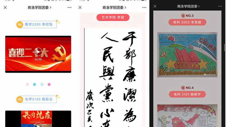 國慶期間,校團委還面向全校師生開展了“喜迎黨的二十大、永遠跟黨走、奮進新征程”主題文藝作品征集評選活動?;顒又?,師生將愛黨愛國的熱情傾注筆端,融入作品創(chuàng)作中。前后共收集到文學類、美術類、視頻類作品150余件,經初審后評選出39件優(yōu)秀作品在校團委公眾號展播,先后有9000余人次訪問、7000余人次參與投票,最終評選出24件最佳作品予以表彰。