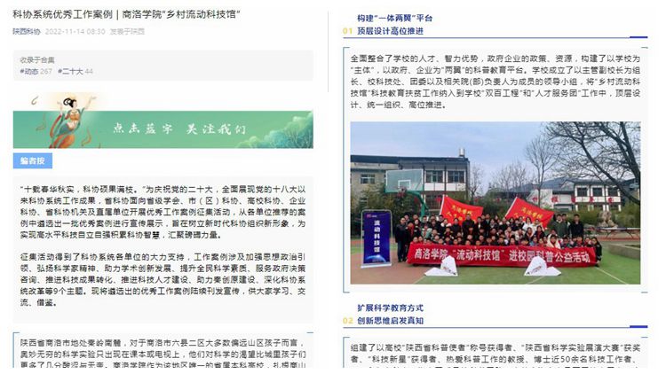 為慶祝黨的二十大勝利召開,全面展現(xiàn)黨的十八大以來科協(xié)系統(tǒng)工作成果,陜西省科協(xié)面向省級學(xué)會、市(區(qū))科協(xié)、高??茀f(xié)、企業(yè)科協(xié)、省科協(xié)機關(guān)及直屬單位開展優(yōu)秀工作案例征集活動,遴選出一批科協(xié)系統(tǒng)優(yōu)秀工作案例,在陜西科協(xié)微信公眾號向全社會展示。我校“鄉(xiāng)村流動館”項目順利入選,并成功獲批中國科協(xié)“翱翔之翼”大學(xué)生科技志愿服務(wù)項目。