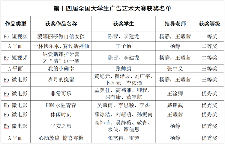 12月15日,第14屆全國大學(xué)生廣告藝術(shù)大賽(以下簡(jiǎn)稱“大廣賽”)全國總評(píng)審獲獎(jiǎng)名單揭曉,競(jìng)賽成果展示云盛典在北京成功舉辦。本屆大賽全國共1869所高校踴躍參賽,170萬余名大學(xué)生積極提交創(chuàng)意作品。我校學(xué)子不負(fù)眾望,分別在平面設(shè)計(jì)、微電影廣告視頻、短視頻等賽道中奮勇拼搏,共計(jì)有10項(xiàng)參賽作品榮獲本屆“大廣賽”陜西賽區(qū)大獎(jiǎng),其中一等獎(jiǎng)1項(xiàng)、二等獎(jiǎng)2項(xiàng)、三等獎(jiǎng)2項(xiàng)、優(yōu)秀獎(jiǎng)5項(xiàng),獲獎(jiǎng)總數(shù)再創(chuàng)新高。