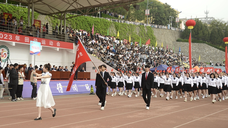 伴隨著激昂的《運動員進(jìn)行曲》,由國旗護(hù)衛(wèi)隊、彩旗方隊、花環(huán)方隊、裁判員方隊、各二級學(xué)院師生代表隊、附屬小學(xué)代表隊、附屬幼兒園代表隊及教職工代表隊組成的17個方隊邁著矯健的步伐,帶著堅定的目光一步步走過主席臺。他們熱情飽滿、口號響亮,充分展現(xiàn)出了我校師生意氣風(fēng)發(fā)、團(tuán)結(jié)進(jìn)取的精神風(fēng)貌。運動員代表王向陽和裁判員代表桑國鵬分別宣誓。